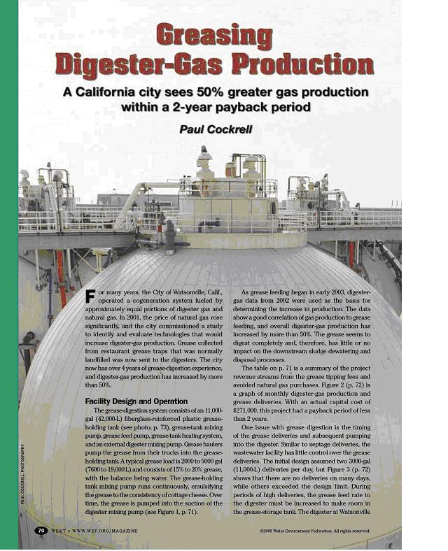 For many years, the City of Watsonville, Calif., operated a cogeneration system fueled by approximately equal portions of digester gas and natural gas. In 2001, the price of natural gas rose significantly, and the City commissioned a study to identify and evaluate technologies that would increase digester-gas production. Grease collected from restaurant grease traps that was normally landfilled was now sent to the digesters. The City now has over 4 years of gease-digestion experience, and digester-gas production has increased by more than 50%.